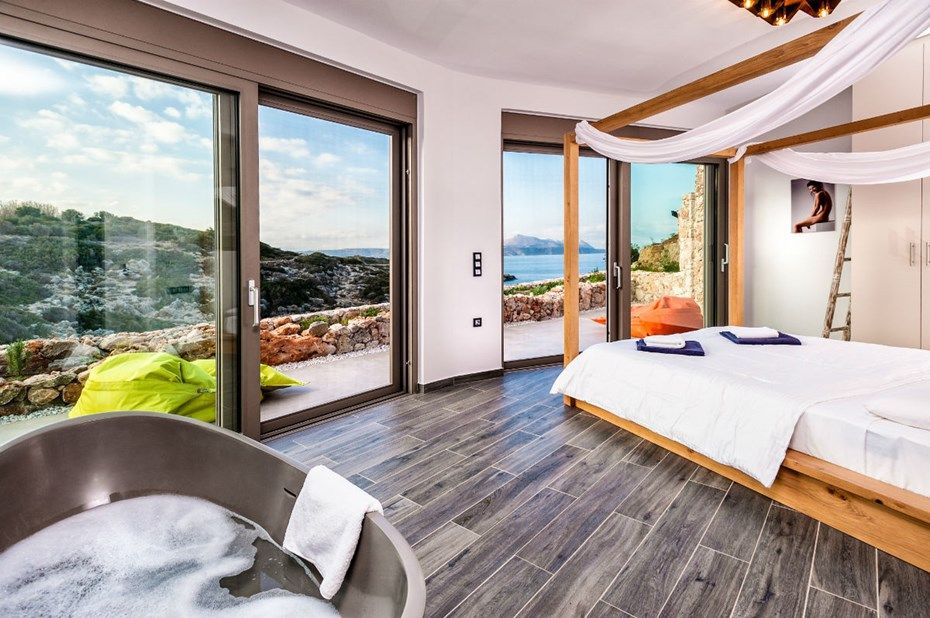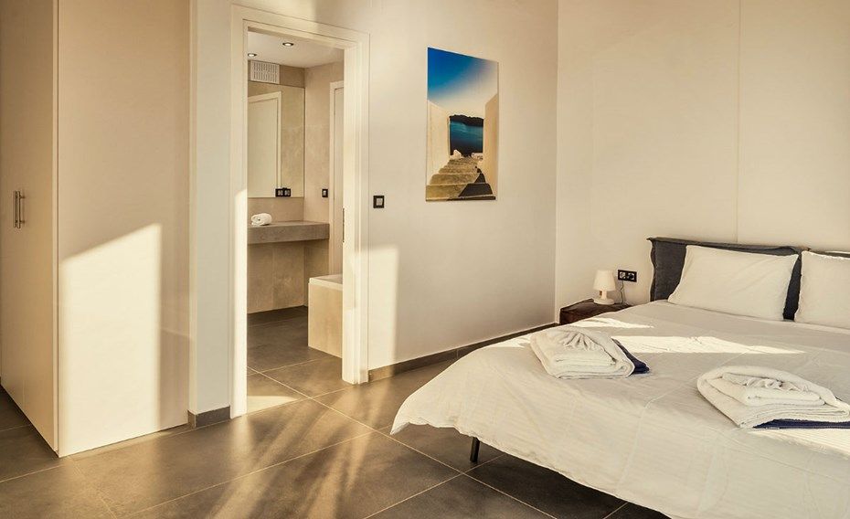 Villa's entry level opens with a large living room, inviting to relax ion the sofas and enjoy the views of the sea. Here you can find a 65-inch flat screen TV with sound system, WIFI internet access. Also, PlayStation game console provided. The fully equipped kitchen has a beautiful central island with granite top, fridge-freezer, oven and ceramic hob, kettle, coffeemaker and set of crockery. Dining table is made of wood and comfortably sits 8 persons. The living area is fully air conditioned with additional underfloor heating system if necessary. Same level houses a master bedroom (reached via staircase) with king size bed and a bathroom, surrounded by large glass areas offering panoramic views. This room also features its private terrace with sunbeds, overlooking the Cretan Sea.