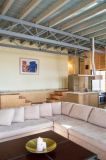 Modern kitchen has all you may need when cooking and incorporates the dining zone and living area. With its high beamed ceilings, pastel-colored decorations, a very homey and relaxing atmosphere is created.