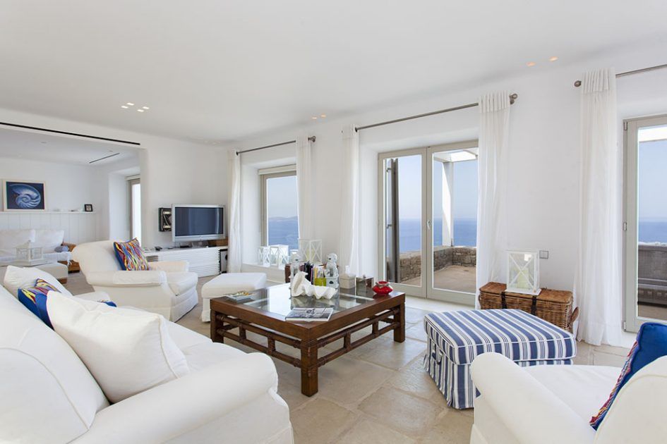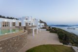Main lounge has few sitting areas with cozy sofas, panoramic windows and entertainment system: plasma TV, CD/ DVD player, stereo. WIFI internet provided throughout the house. There is also a dining area and a kitchen, modernly equipped and is very convenient for self-cooking, includes electric hob/oven, microwave, fridge-freezer, full set of crockery and utensils. Laundry facilities provided as well. Outdoor facilities offer plenty of space on the main terrace by the swimming pool. Guests can relax here any time of the day – swim and sunbath in the morning, relax in the afternoon, and dine alfresco in the evening. Necessary barbeque accessories provided. The villa stands in a short distance from the airport and within 10 minutes’ drive from the port and main town with wide choice of shopping, dining and entertainment. From the port you can make a day trip to the neighboring Cycladic islands.