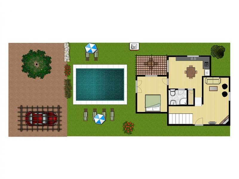 Outdoor territory is covered with trees, green lawn and of course has a private pool in front of the villa. Sunbeds and umbrellas provided for guests' relaxation. Moreover, there is a traditional brick-built barbeque oven at guests' disposal to cook the most delicious meals.