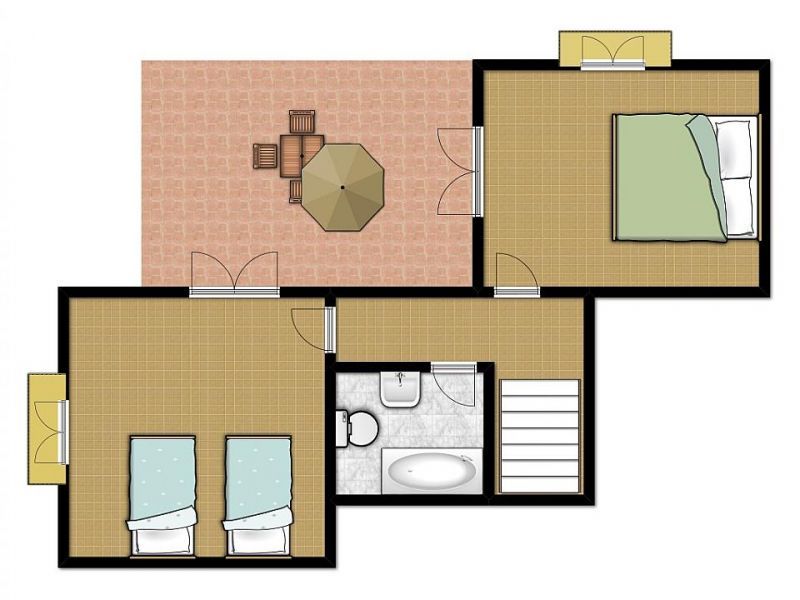 Upper floor hosts two more bedrooms - one double, one twin. Both bedrooms are tastefully furnished, with private balcony each and share a bathroom(full tub) and a sea view terrace.